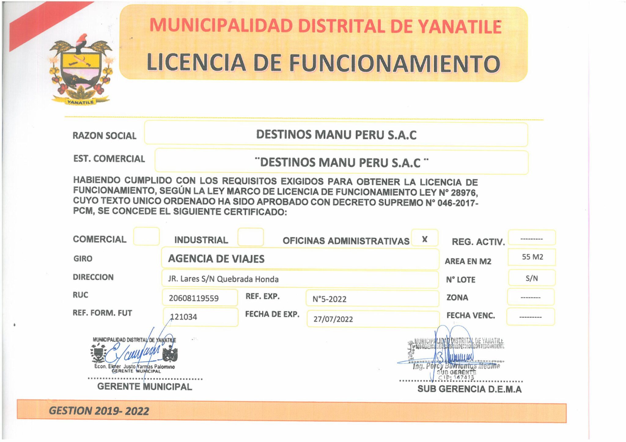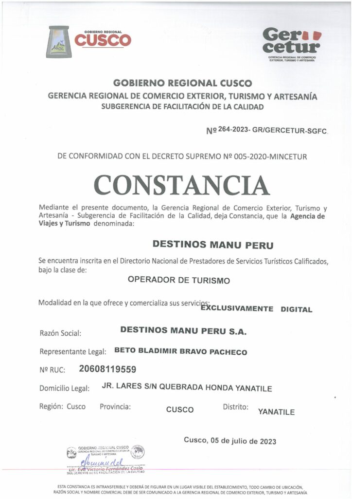 Destinos Manu Perú es una empresa que está constituida por dos hermanas aventureras, responsables y sobre todo el amor que las une transmitiéndolo en lo que hacen. Se crea en febrero del 2023, con la finalidad de convertirse en una agencia que garantice al viajero disfrute, seguridad y calidad. La experiencia, el compromiso y el buen trato de nuestra gerente general en el rubro del turismo nos fortalece para crecer y ganarnos la confianza de los viajeros. La titular es una persona profesional, responsable, respetuosa y sobre todo disciplinada para velar por la seguridad de nuestros clientes. Nuestra asesora de ventas cuenta con un vasto conocimiento en ventas y relaciones sociales, cuyo valor fundamental es el carisma, la responsabilidad y el compromiso para con sus clientes.
